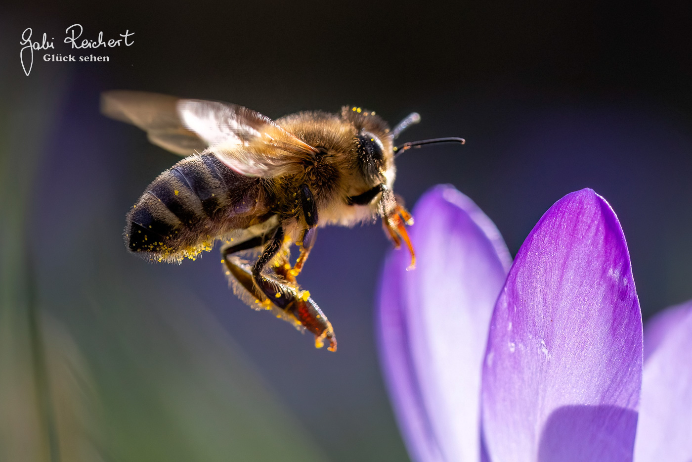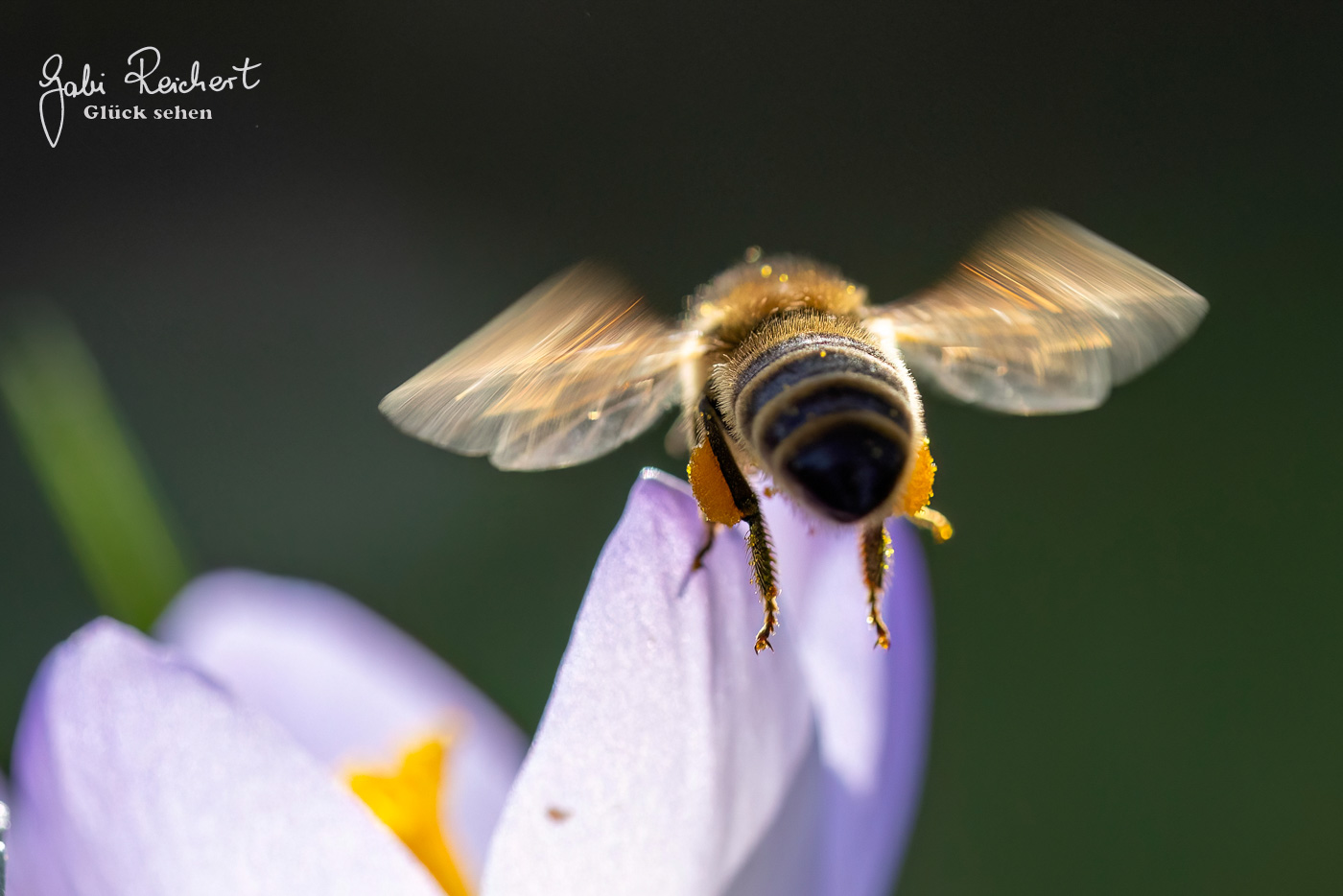 Wenn die Sonne rauskommt, kommen auch schon die ersten Bienen. Über dem Blütenteppich der Krokusse auf dem Friedhof in Bubenheim summte und brummte es. Es ist zwar schwierig, die Bienen im Flug zu fotografieren und ich produzierte auch wesentlich mehr Ausschuss als sonst, aber die Ergebnisse sprechen für sich.