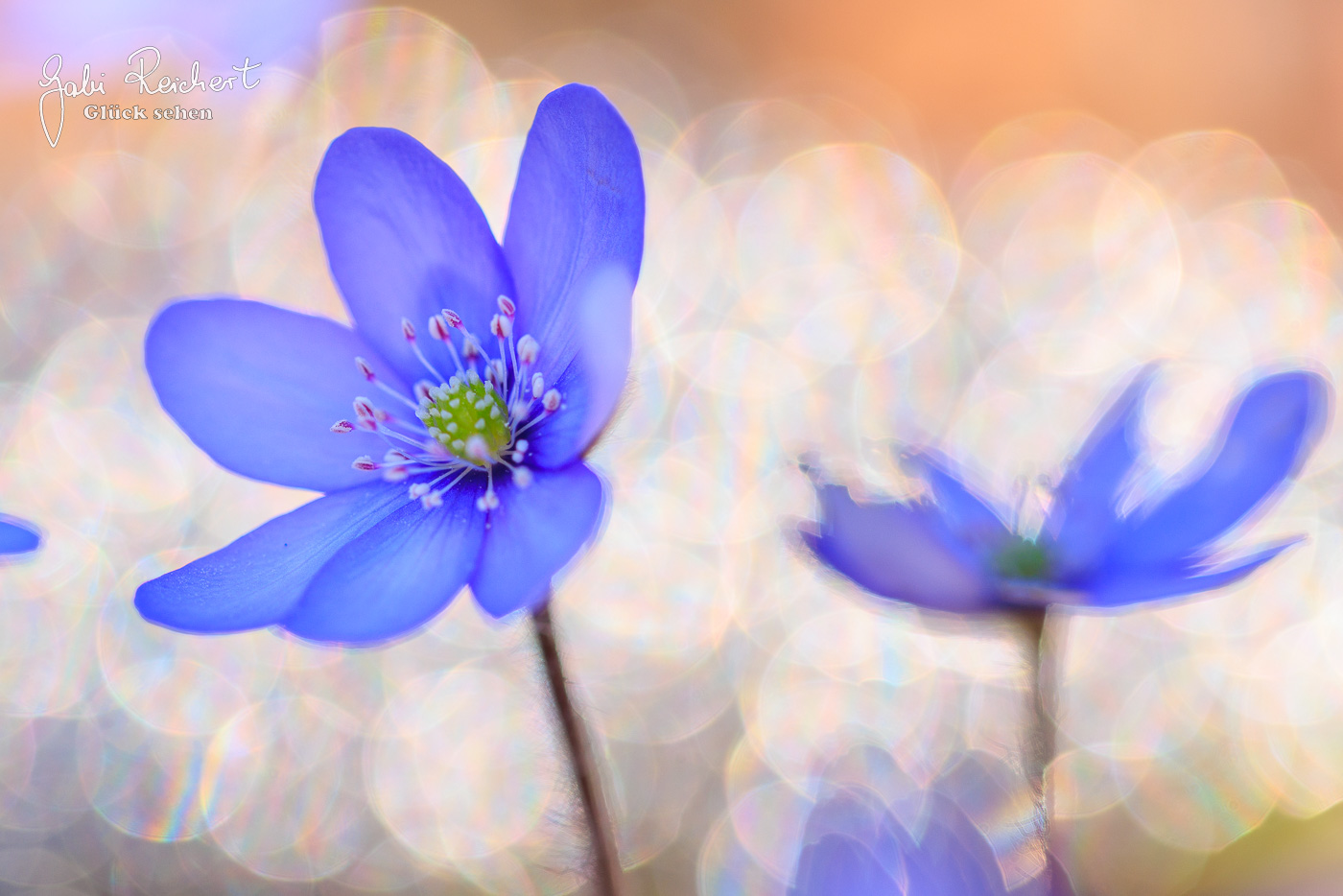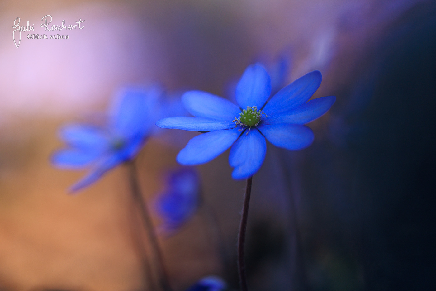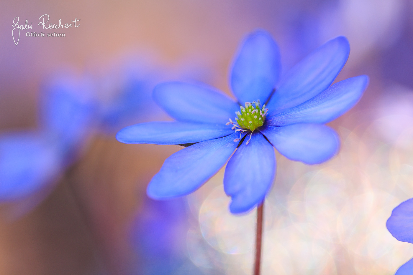 Beim Hintergrund achte ich auf die Verteilung von hellen und farbigen Flächen. Störende Grashalme und Zweige, die vor meiner Blüte durchs Bild laufen, zupfe ich aus oder biege sie zur Seite. Oftmals nutze ich aber auch gerade Objekte im Vordergrund, die dann in der Unschärfe verschwinden, um Tiefe zu schaffen. Das Foto wirkt mit einer unscharfen farbigen Blüte im Vordergrund sehr luftig.