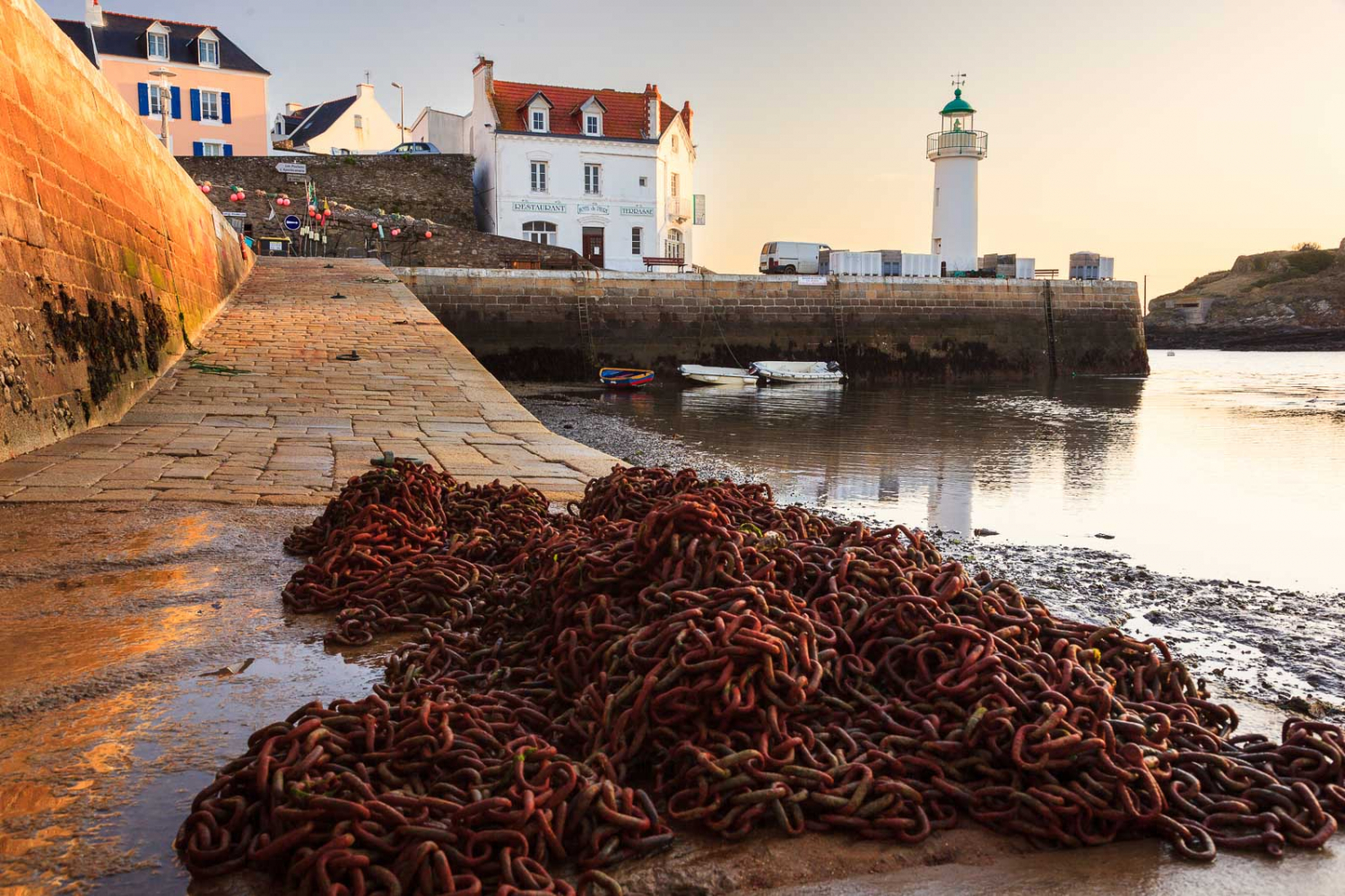 Wir haben keine Fahrräder mit, weil wir die Küste entlang wandern wollen. Sie wären immerhin praktisch gewesen, um schnell in den Norden der Insel zum kleinen Leuchtturm Le Paon zu kommen. Wir fotografieren den Leuchtturm auf den Klippen im warmen Morgenlicht.