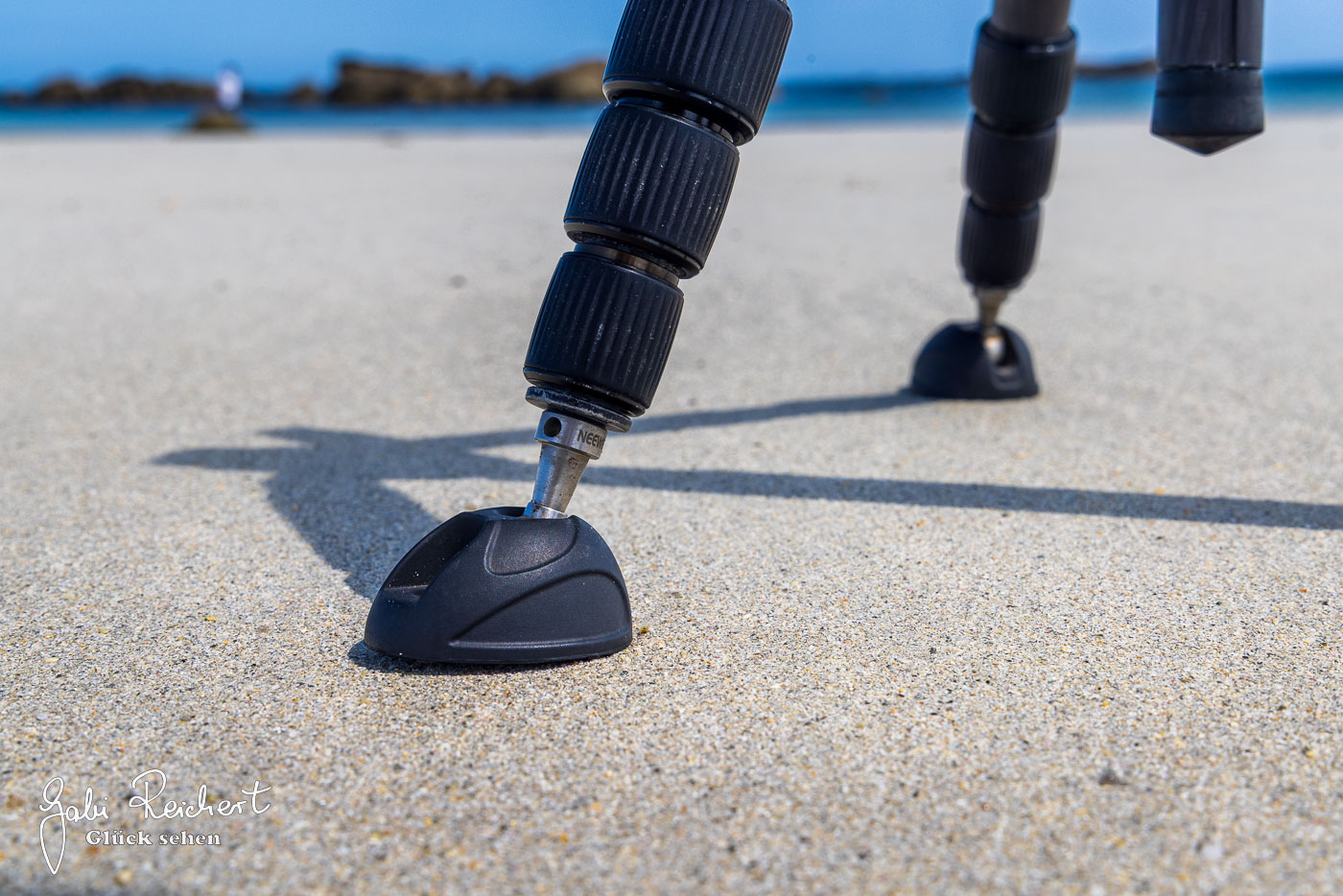Ich fotografiere gern mit längeren Belichtungszeiten sehr nah am Wasser. Da sackt das Stativ sehr schnell im nassen Sand ein. Ich habe lange nach praktischen Füßen für mein Stativ gesucht. Die meisten Strand – oder Schneefüße waren für meinen Geschmack zu groß und dadurch unpraktisch. Ich fotografieren ja auch im Wechsel am Strand, dann wieder an der Felsenküste oder vom Küstenpfad aus mit grasigem Untergrund.