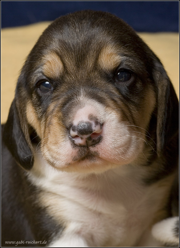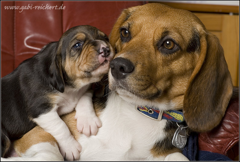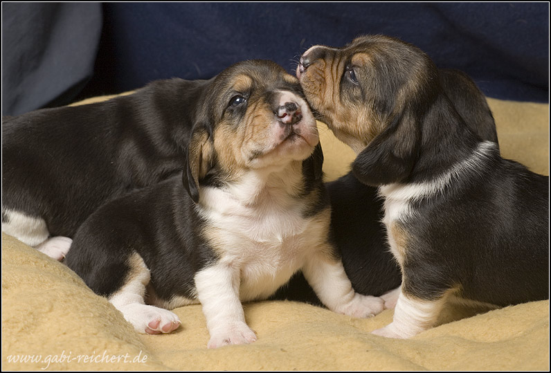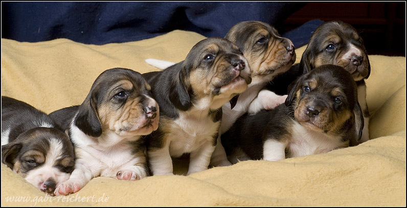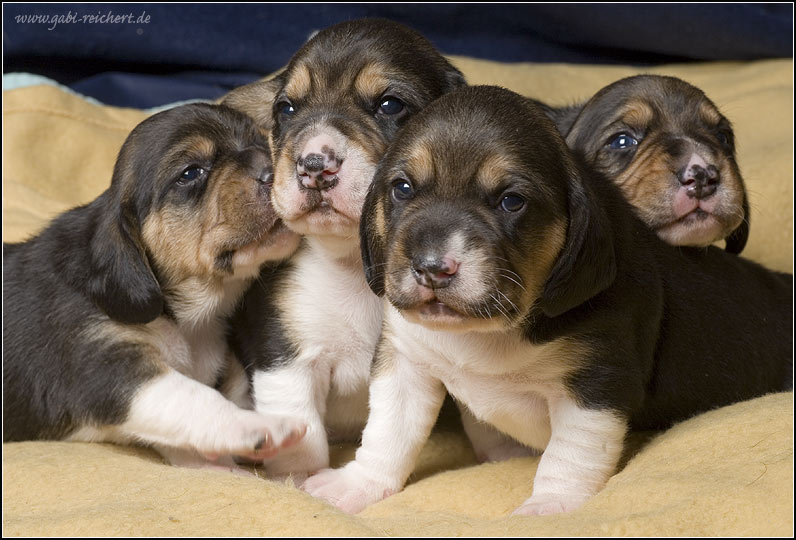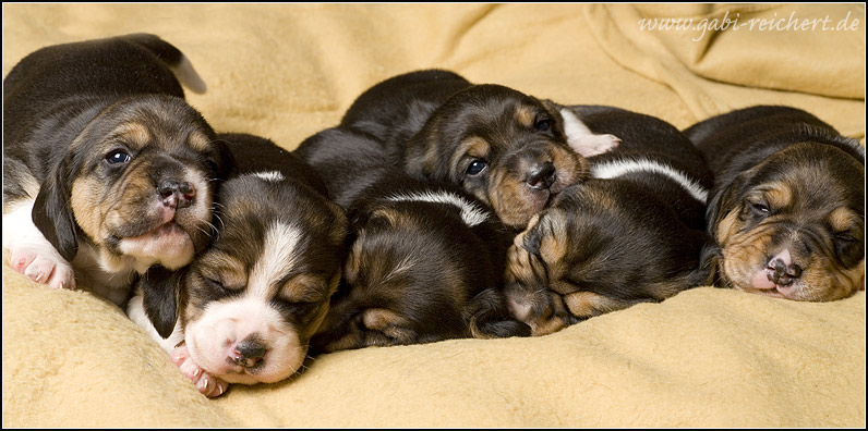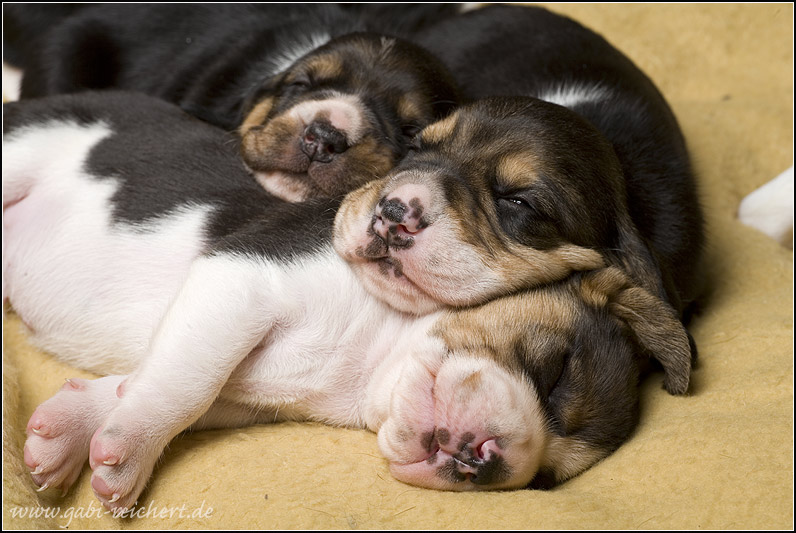 Heute sind die kleinen Beaglewelpen 16 Tage alt. Sie werden von Tag zu Tag munterer und sehen nun so richtig nach Hund aus:-)