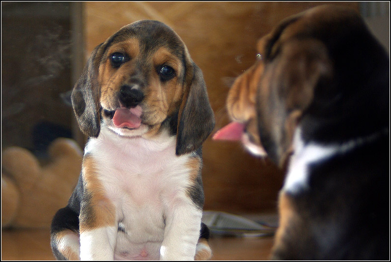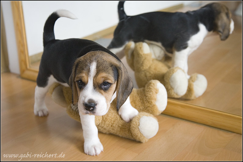 Gunter baute das "gehege" um, dazu mußten die Welpen in die Küche. Und siehe da: sie standen alle vor dem Backofen, weil sie sich darin sehen konnten. Das war ein Spaß. So holten unsere Kids einen Spiegel und der findet nach wie vor großen Andrang.