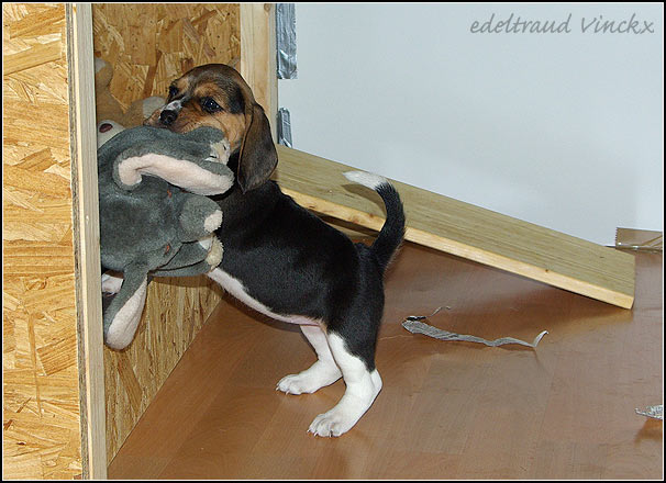 Es ist sehr interessant zu sehen, daß die Welpen ihre Spielsachen NIE draußen liegen lassen. Echt! Ein Phänomen, alles wird immer reingeschleppt, egal wie schwer. Hier trägt Mimi den Elefanten hinein:-) (Auch ein Bild von meiner Mutter)