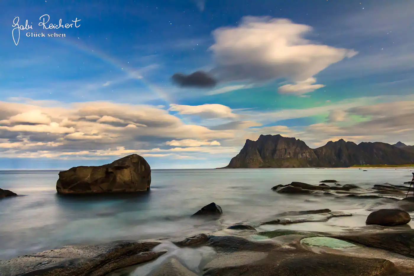Das war eines der außergewöhnlilchsten Polarlichter, die wir bisher gesehen haben. Zum ersten Mal sahen wir einen Mondbogen, weil es in der Vollmondnacht nieselte, und oben drüber einen Nordlichtbogen. Wahnsinn!
